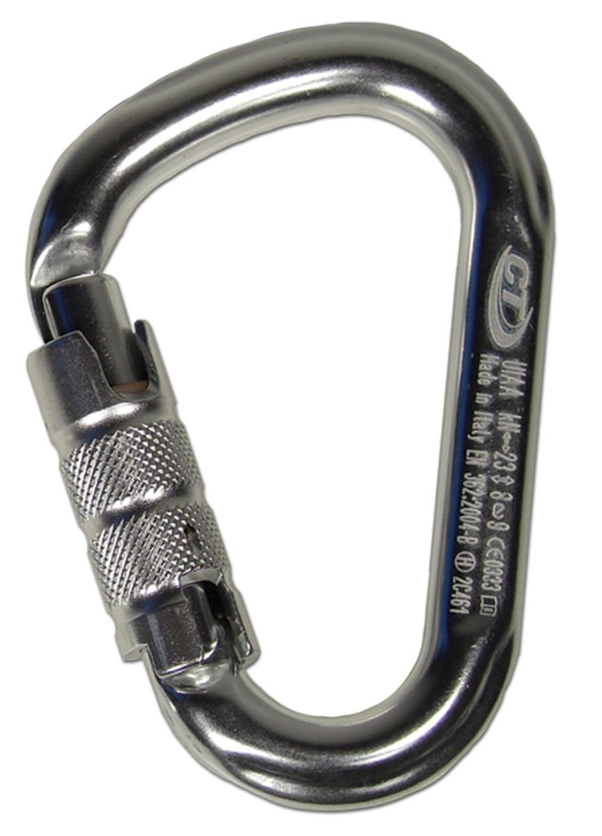 Birnenförmiger Aluminiumkarabiner mit 3-fach Sicherung des Schnappers gemäß FwDV 1.