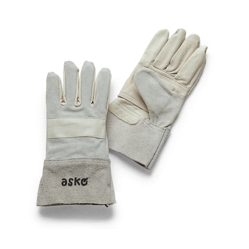 Fünffingerhandschuh aus Rindnarbenleder (ca. 1,2 mm) an der Handinnenseite, Knöchelschutz und Pulsschutz, sowie an der Innenhand- und Daumenverstärkung. Nahtschutz am Daumen, Mittel- und Ringfinger und den Fingerspitzen. Handrücken und lange Stulpe aus Rindspaltleder