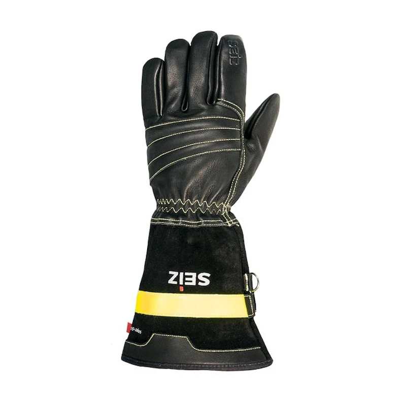 - Stulpe: Weite Stulpe aus hitzebeständigem und imprägniertem Spezialleder und einem gelbem Reflexstreifen aus 3M Scotchlite™. D-Ring und Karabiner zur Befestigung der Handschuhe an der Einsatzjacke.
