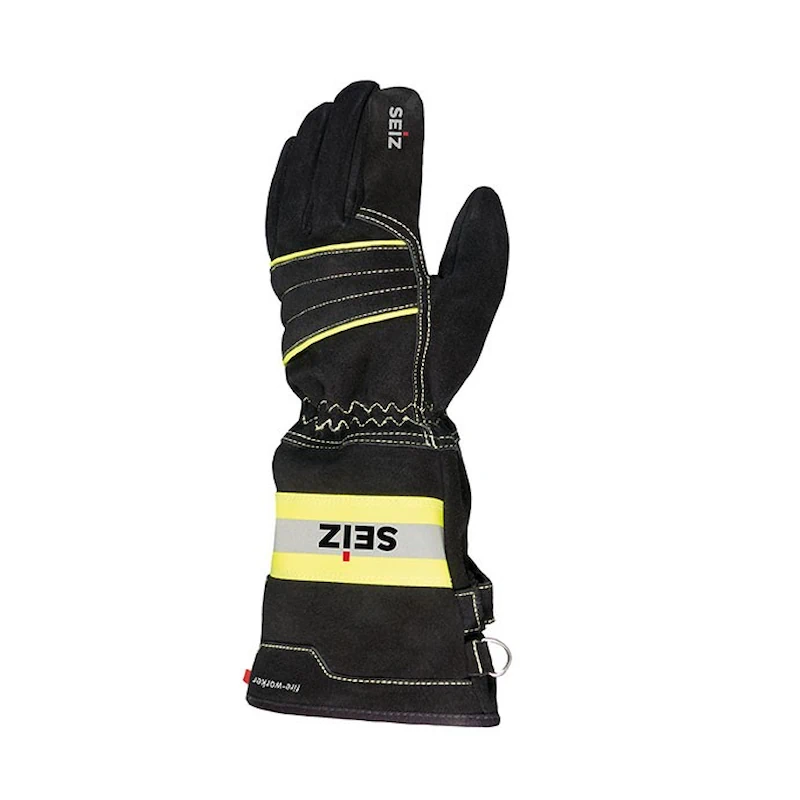- Stulpe: Weite Stulpe aus hitzebeständigem und imprägniertem Spezialleder und einem gelb-silber-gelbem Reflexstreifen aus 3M Scotchlite™. D-Ring und Karabinerhaken zur Befestigung der Handschuhe an der Einsatzjacke.