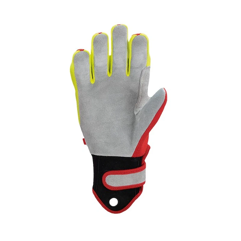 - Rückhand: Flammhemmendes Modacryl in Rot, Schwarz und Gelb, unterlegt mit Gel-Knöchelprotektoren.