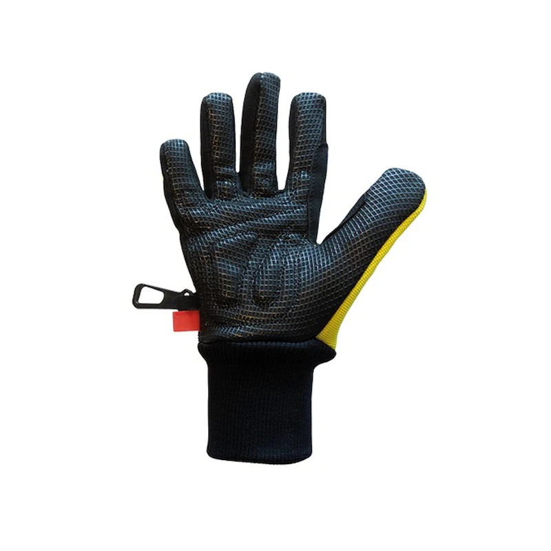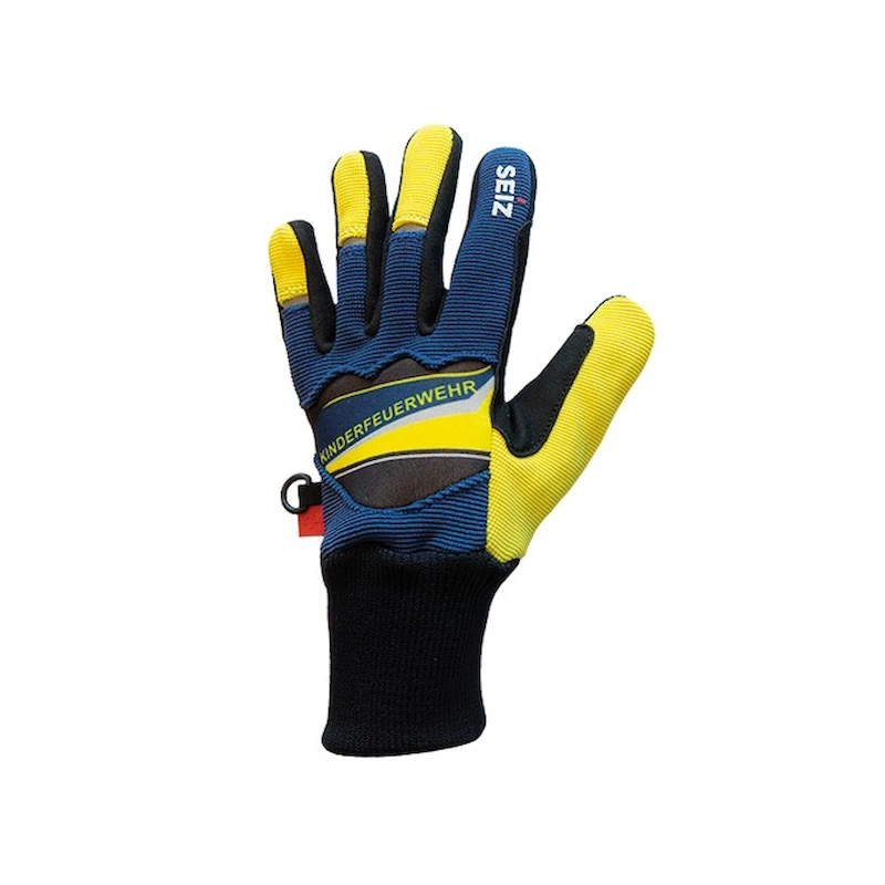 - Rückhand: Aus blau- und gelbfarbenem Nylon, mit angenehm weicher Acrylfütterung, reflektierenden Fingereinsätzen und Sublimationsdruck „KINDERFEUERWEHR“ auf Neopren.