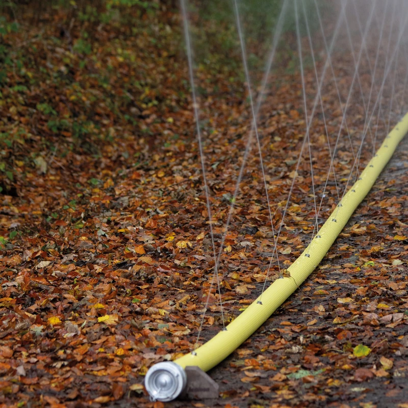 Gefertigt aus synthetischem Polydur-Gewebe, innen und außen gelb gummiert, überzeugt der Schlauch durch hohe Chemikalien- und Säurebeständigkeit sowie eine lange Lebensdauer. Die V-förmig versetzten Düsenpositionen sorgen bei Wasserbeaufschlagung für eine automatische Stabilisierung und verhindern zuverlässig ein Verdrehen des Schlauchs.
